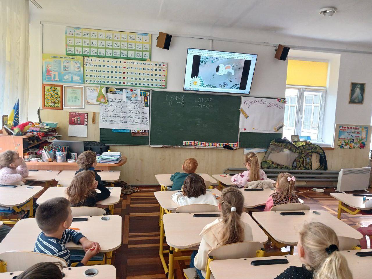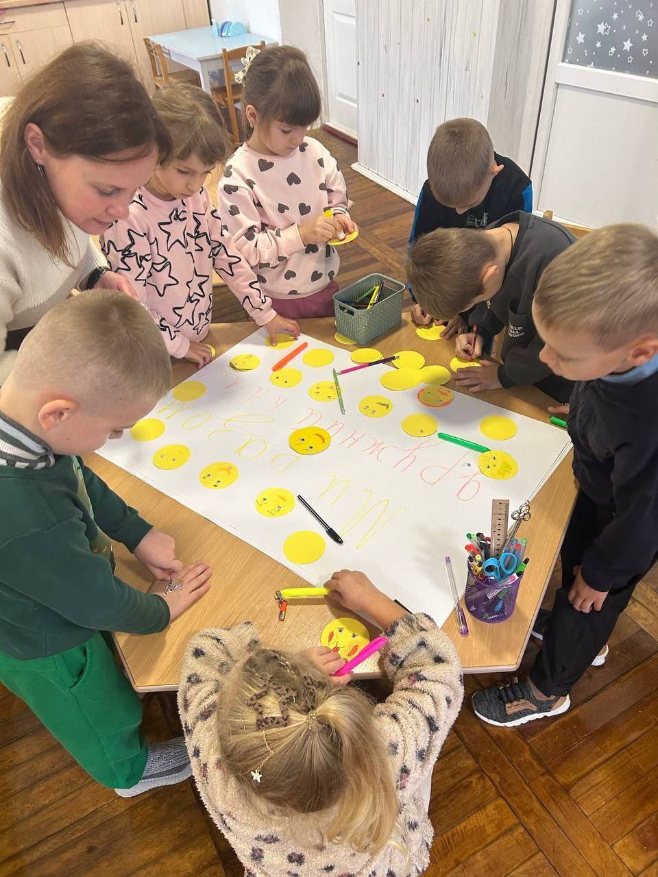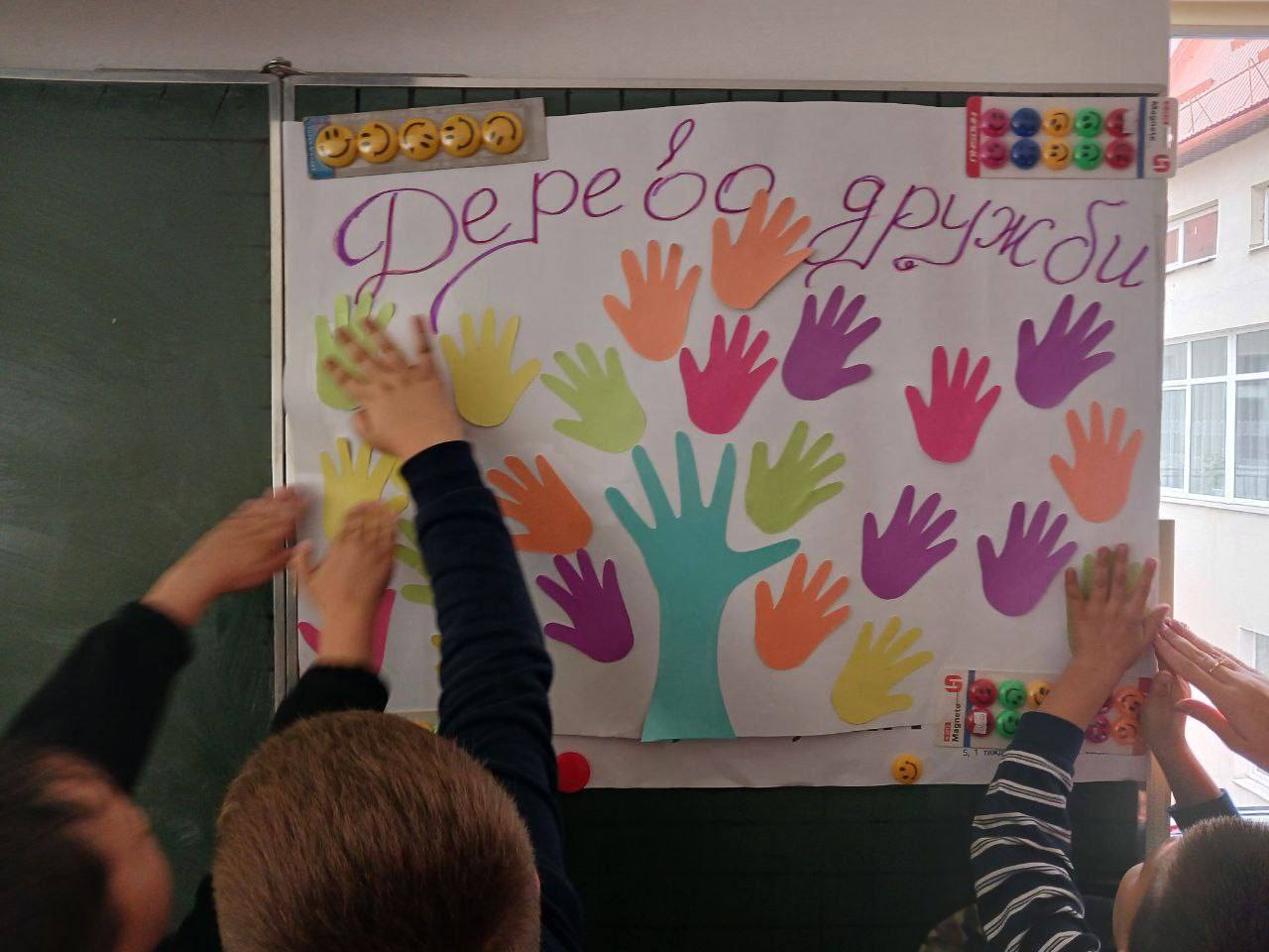 Першокласники разом із практичною психологинею нашого закладу створювали «Дерево дружби» та оформлювали плакат «Ми разом — дружній клас», наклеюючи власноруч виготовлені смайлики — символи радості й єдності.